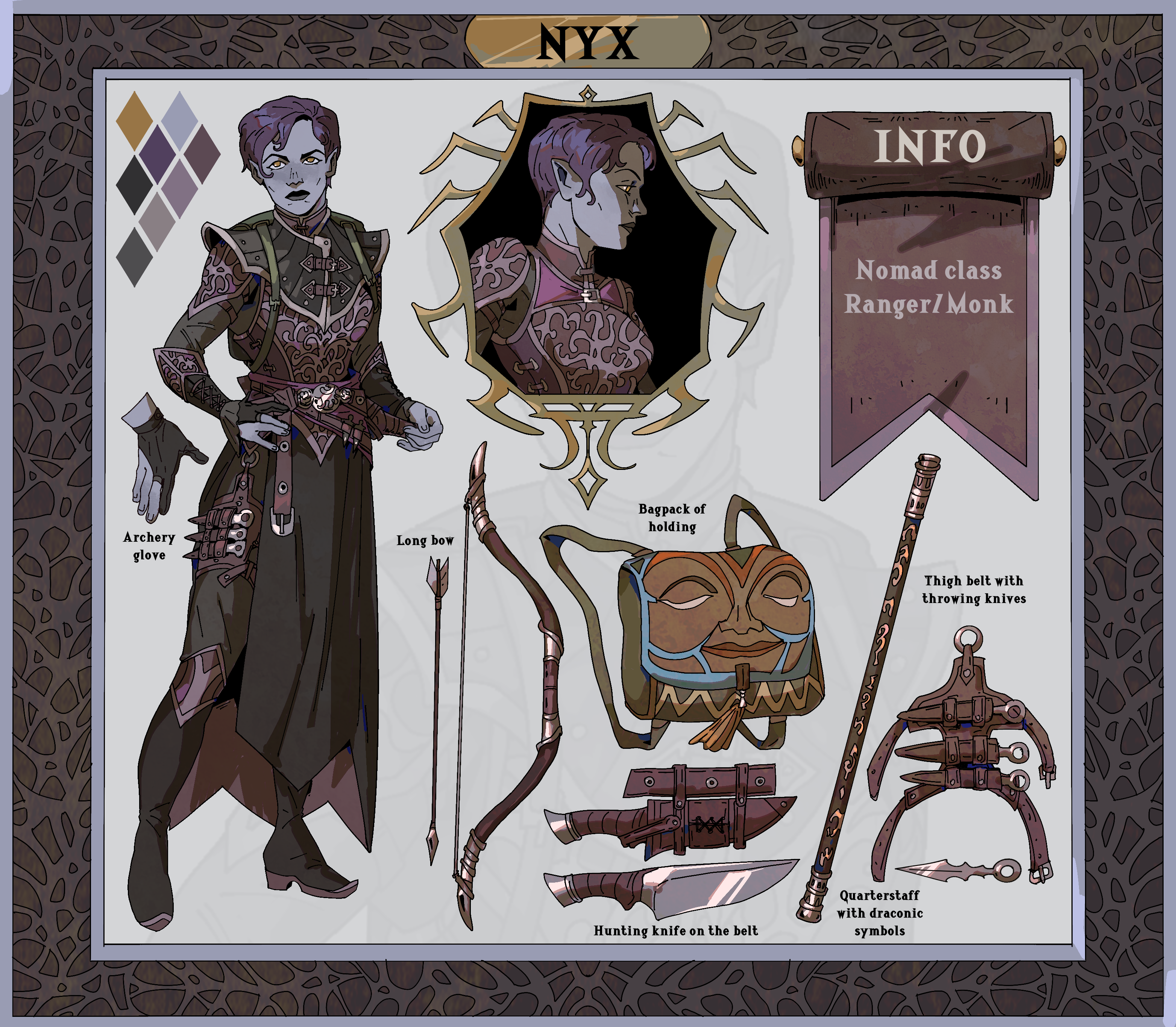 After wrestling with CanvaAI I managed to spackle together a character profile of Nyx. It is a bit annoying that AI can't replicate faces from a reference and the new, uh, Nyxes(?) have longer hair, but all-in-all it came out decent enough that I'm fine with it. I consider these pics as illustrative stop-gaps more than anything else so I'm not too hung up on them looking exactly right... Nyx would complain about the 'useless flaps' though.